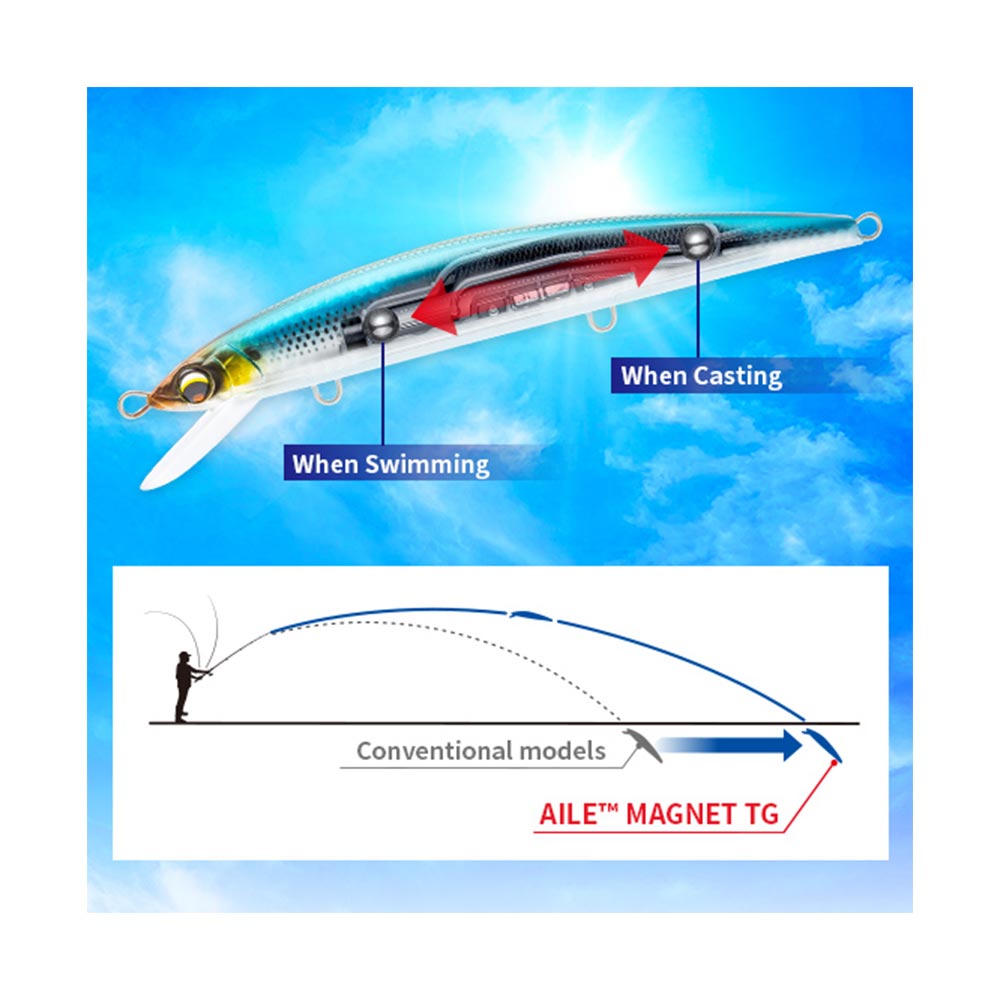 Το Aile Magnet TG Minnow Slim είναι ένα κορυφαίο τεχνητό που συνδυάζει υψηλή τεχνολογία, ρεαλιστική δράση και αξιοπιστία, σχεδιασμένο για απαιτητικούς ψαράδες που θέλουν μέγιστη απόδοση σε κάθε εξόρμηση. Mε μήκος 145 mm και βάρος 30 gr που εξασφαλίζουν μεγάλη βολή και ακρίβεια σε κάθε ρίψη, ενώ το καινοτόμο Magnet TG system μεταφέρει το βάρος εσωτερικά, προσφέροντας σταθερότητα κατά τη ρίψη, ιδανική πλεύση και φυσικό wobble‑and‑roll action, που προσελκύει τα πιο καχύποπτα αρπακτικά ψάρια, μιμούμενο με ακρίβεια τη φυσική κίνηση των μικρών δολωμάτων στο νερό. Το λεπτό και flat σώμα του δολώματος είναι σχεδιασμένο για ρεαλιστική εμφάνιση και έντονη δράση, ενώ η ανθεκτική κατασκευή με through‑wire body και υψηλής ποιότητας αγκίστρια εγγυάται ασφάλεια ακόμα και με μεγάλα και δυνατά θηράματα. Διατίθεται σε ποικιλία χρωμάτων που προσαρμόζονται σε κάθε συνθήκη φωτισμού και νερού, ενώ η ελαφριά και ευέλικτη σχεδίασή του εξασφαλίζει άριστο χειρισμό, φυσική κίνηση και μέγιστη αποτελεσματικότητα, καθιστώντας το ένα απαραίτητο τεχνητό για ψαράδες που επιδιώκουν αξιοπιστία και μοναδική απόδοση σε κάθε ψάρεμα.